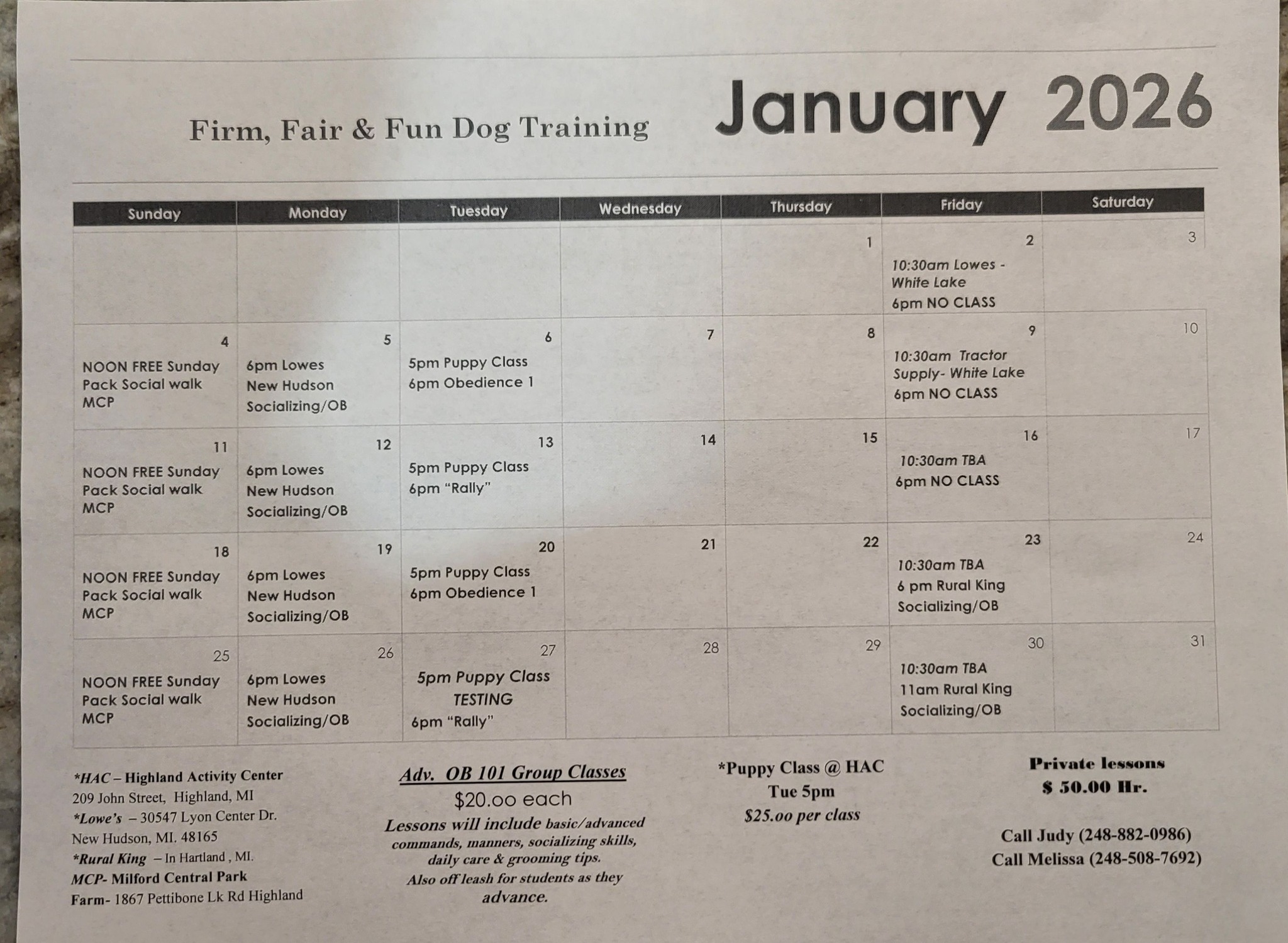 Firm, Fair & Fun Dog Training Schedule